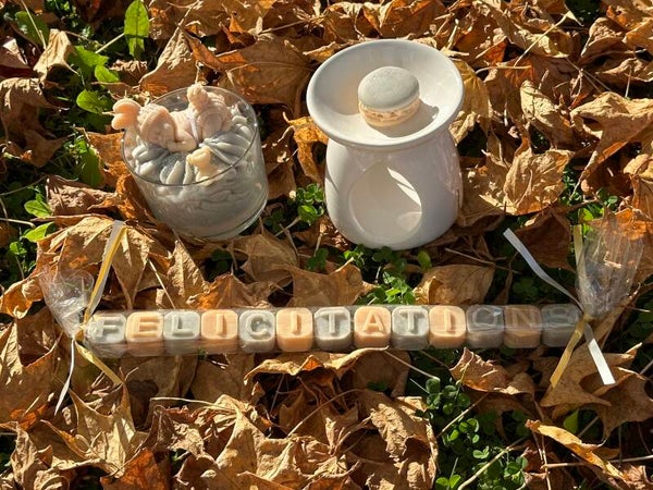 Votre coffret sera composée : D'un Bruleur - D'une Bougie gourmande Bébé, - D'un message lettres fondantes - D'un Macaron - D'une boite cadeau